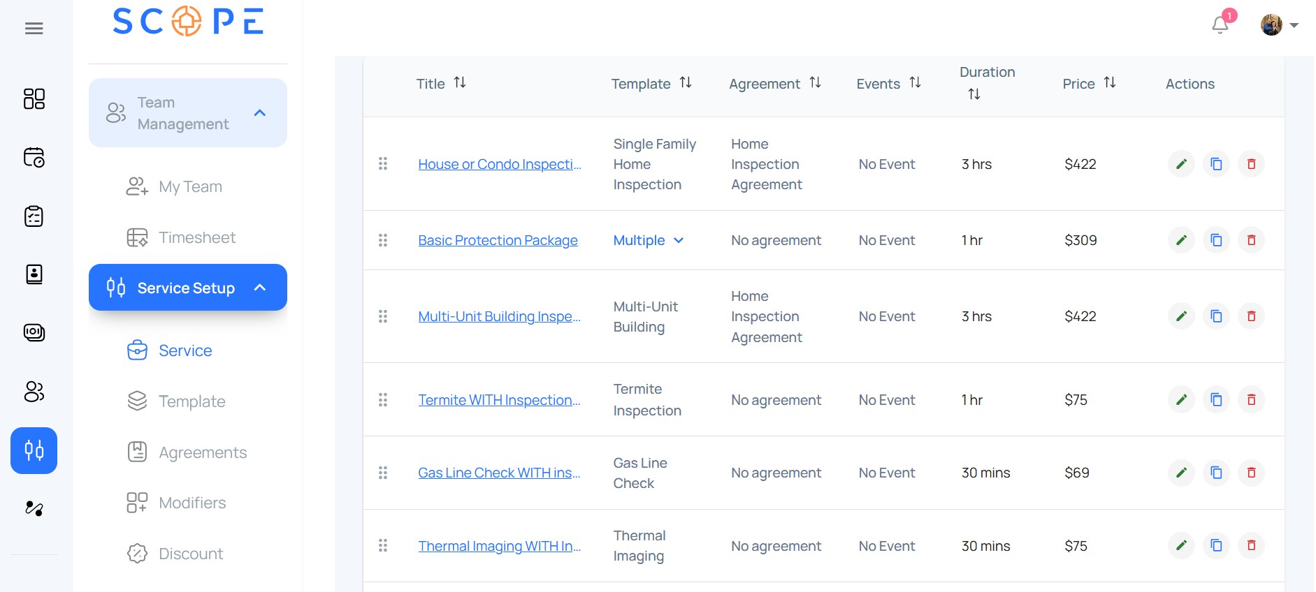 Complete service catalog management for inspection businesses. Configure unlimited service types with custom pricing, templates, and agreements—all automatically applied when scheduling.